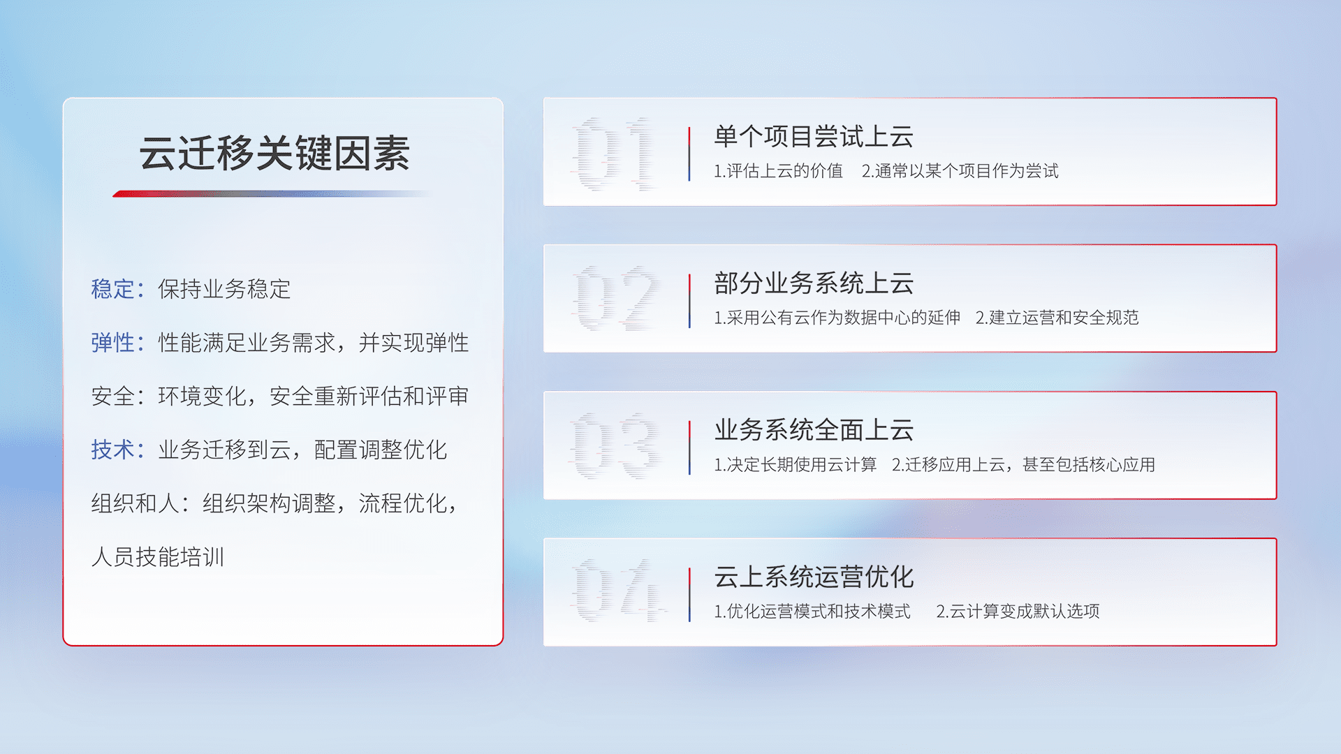 结合实际业务,,从规划设计、、、云平台选型、、、云原生改造、、数据迁移、、、、集成交付,,,迁移全过程为客户识别最佳上云路径,,,,做好风险识别管理,,,,设计网络架构、、、、身份权限、、安全审计合规、、、、操作审计、、、、日志审计、、监控告警策略、、、、多站点容灾设计等,,对云上基础设施进行整体规划,,提升IT治理水平,,,以满足弹性、、、高可用、、、、高性能的需求。。。。